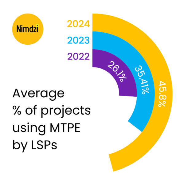 根據(jù)最新的 2025 年 Nimdzi 調(diào)查數(shù)據(jù),MTPE的平均采用率在兩年內(nèi)激增75%,從2022年的26%攀升至2024年的46%。然而,廣泛的采納并未帶來均勻的效率提升,不同組織間的實施效果呈現(xiàn)出顯著落差,這表明巨大的效能潛力仍未被充分釋放。